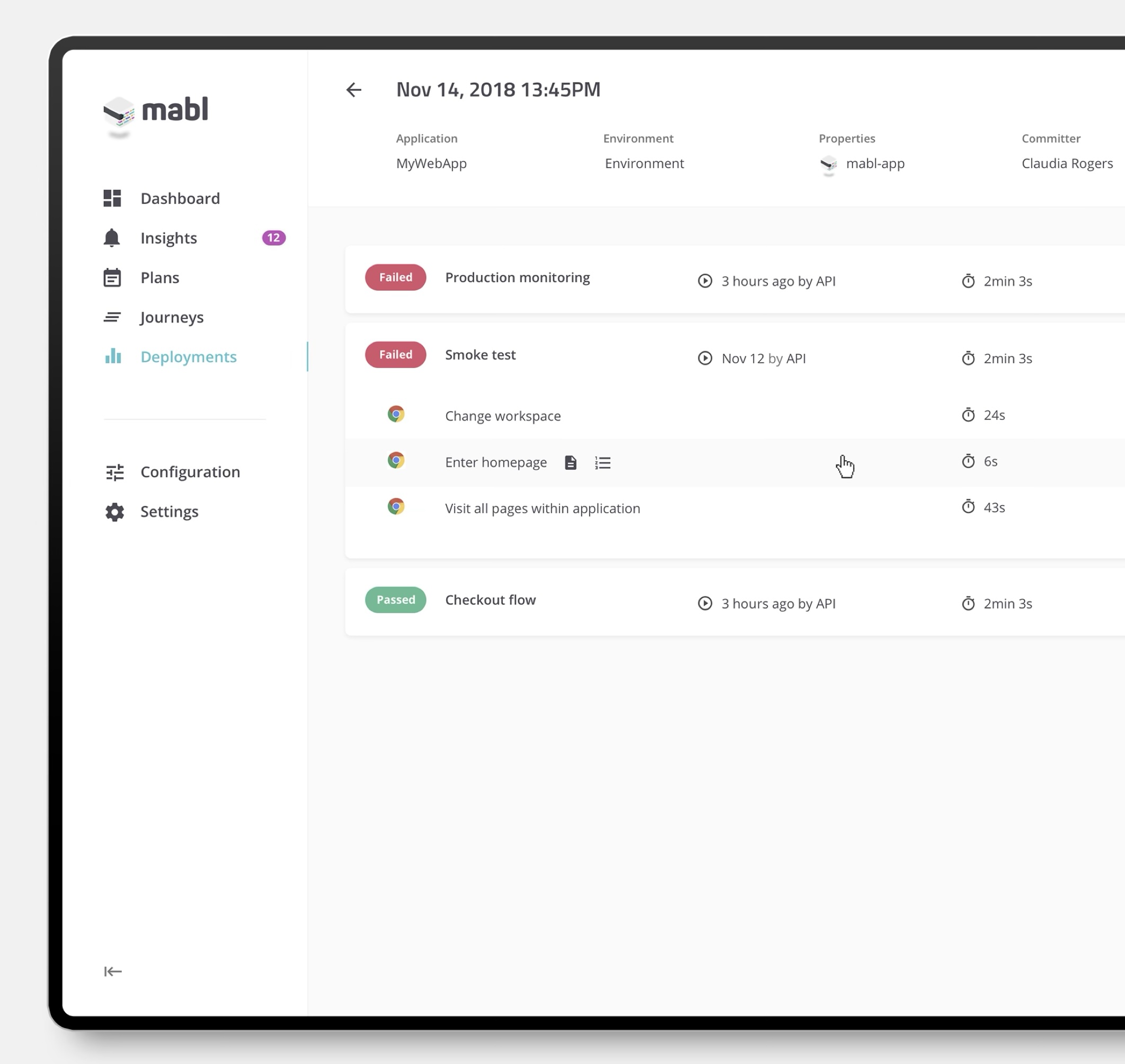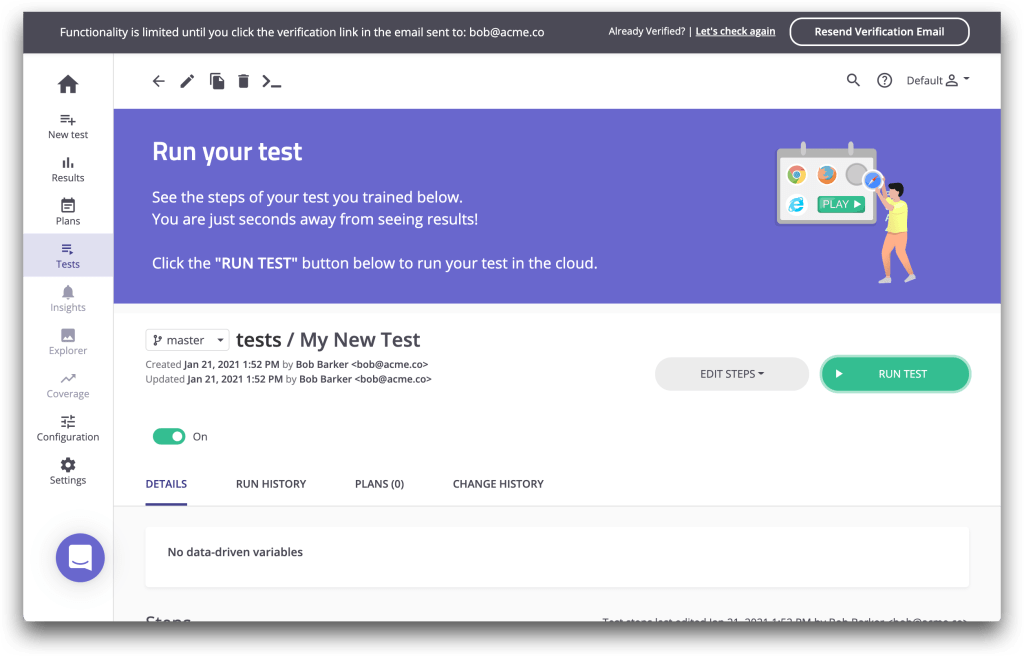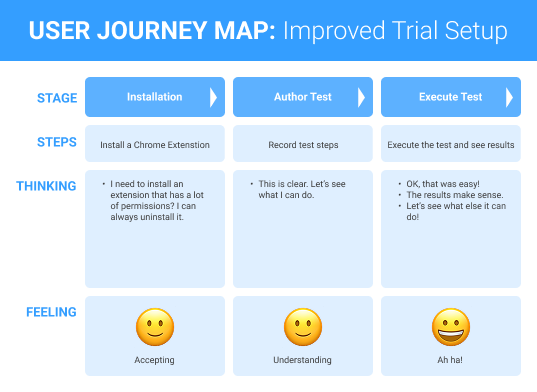 Eliminating just two steps would make it quicker and easier to try out mabl’s core value (creating and executing robust tests) and discover what else mabl offered. However, that was not a simple proposition due to some early design assumptions and dependencies. In collaboration with the product and engineering teams, we worked out the least disruptive ways to make two significant product changes explained below.